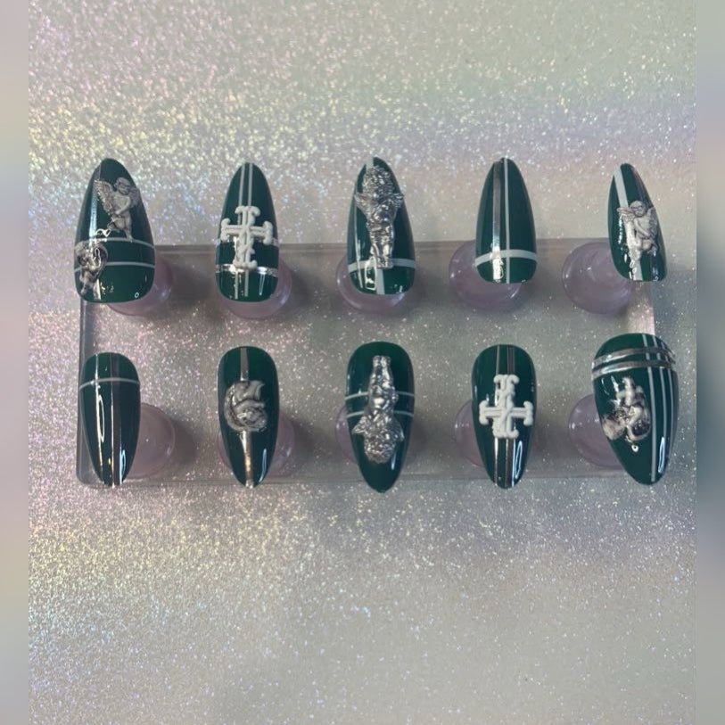 Elevate your manicure with ANGELiC ESSENCE (KK#323), featuring medium cerulean almond-shaped press-on nails. Each nail is adorned with elegantly placed stripes and topped with delicate angel and cross charms, creating a refined and spiritual aesthetic. Finished with a glossy top coat, these nails offer a polished, long-lasting shine perfect for any occasion. Make em say " Holy Style"!