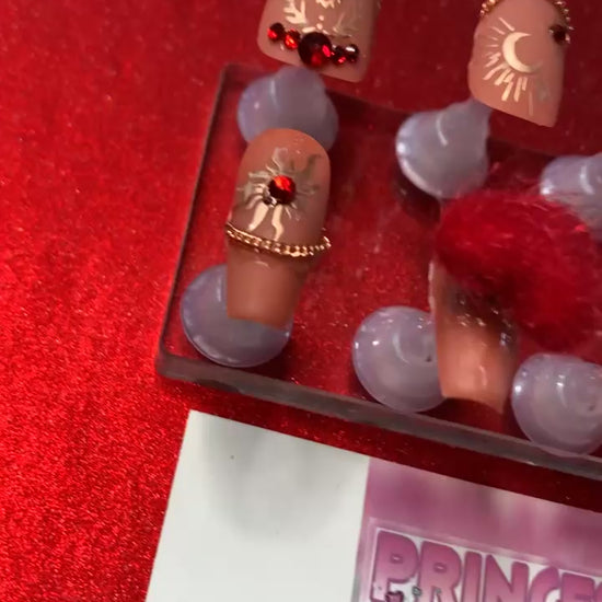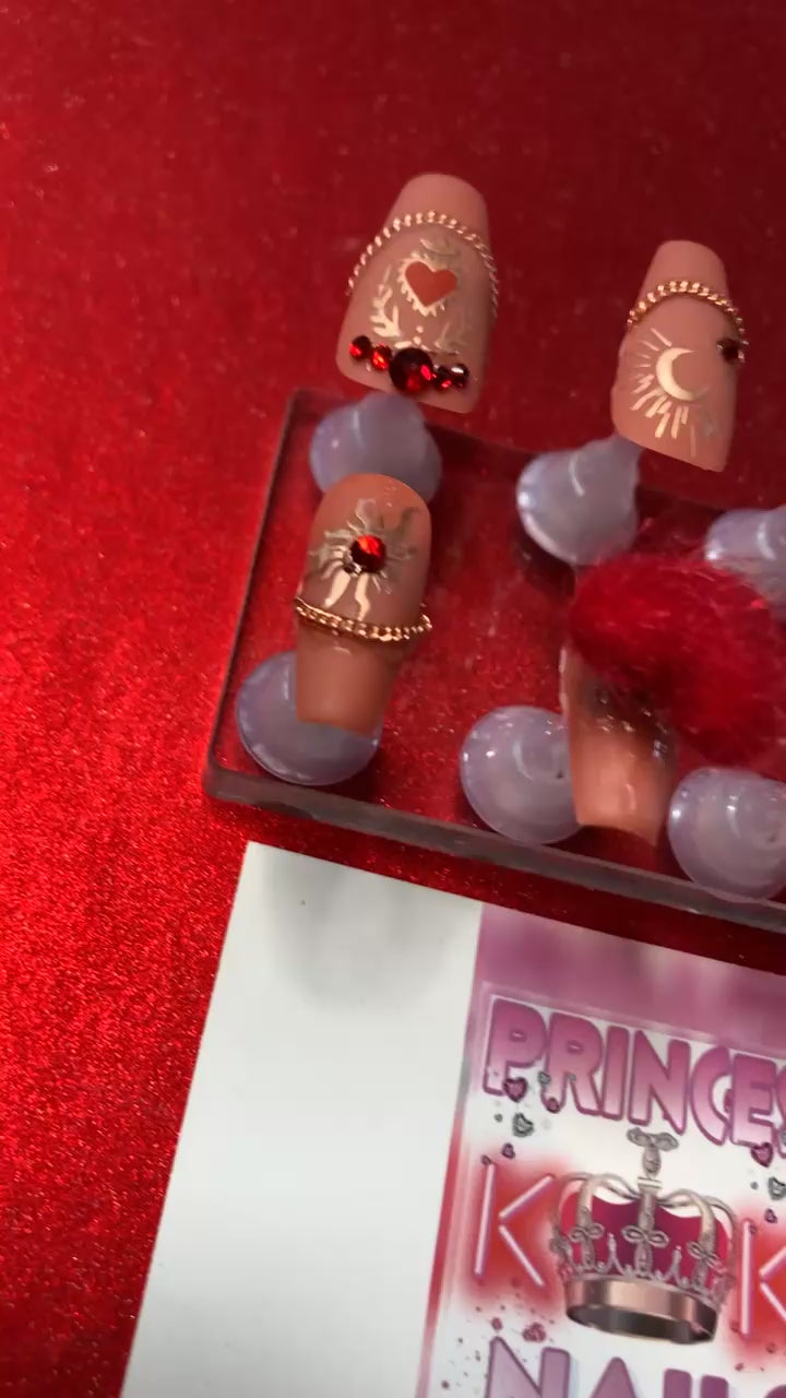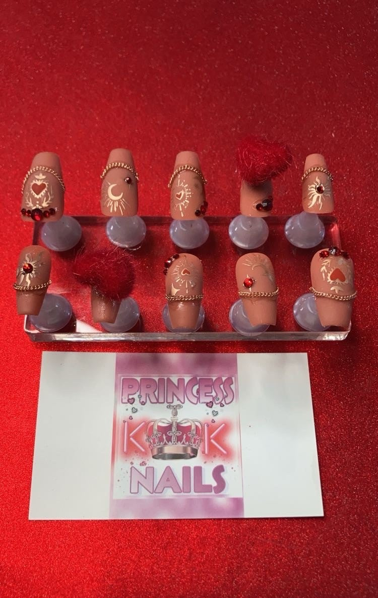 Elevate your nail game with these medium coffin-shaped blush pink press-on nails featuring delicate nail chains as French tips. Adorned with charming sun, moon, and heart motifs accented in rose gold, they offer a sophisticated celestial touch. Finished with two magnetic red fuzzy pom pom hearts and a matte top coat, these nails combine playful texture with elegant design for a standout look that’s both trendy and refined. Perfect for those seeking a unique, expert-level manicure without the salon visit.