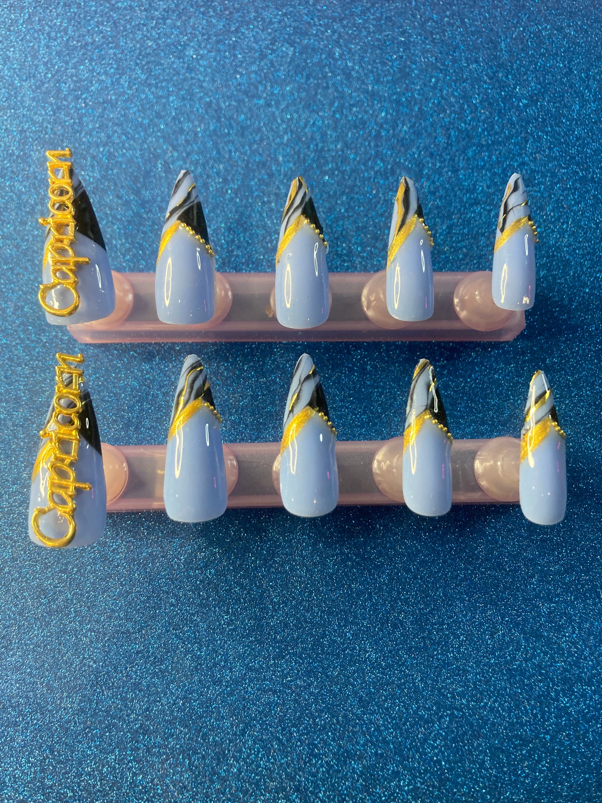 These XL stiletto press-on nails feature a sophisticated baby blue base with elegantly decorated French tips. The tips showcase a refined marble pattern accented with gold details and gold rhinestone balls, adding a touch of luxury. Marvelously topped with a distinctive Capricorn nail charm and sealed with a glossy top coat for lasting shine and durability. Perfect for those seeking a stylish, zodiac-inspired manicure with expert craftsmanship.