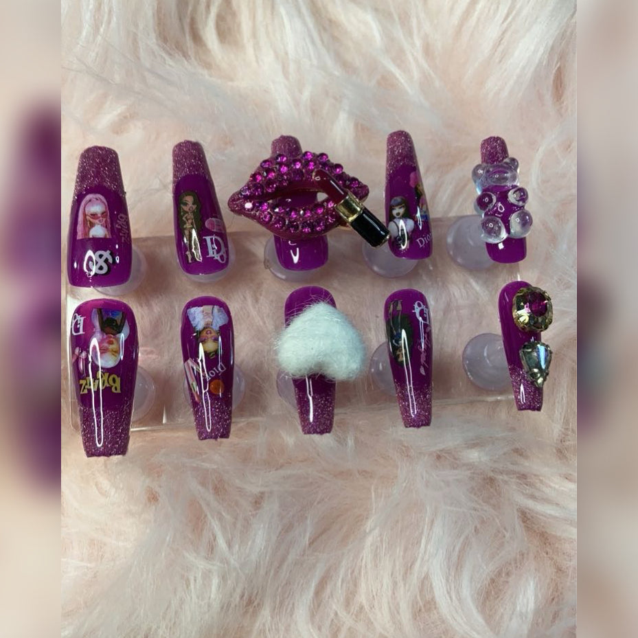 Expertly crafted XL coffin shaped press-on nails featuring a striking Bratz theme with rich purple base and delicate light purple sparkle French tips. Each set is meticulously adorned with premium charms, including statement giant lips and an eye-catching magnetic fluffy heart. Finished with a professional-grade glossy top coat for maximum durability and salon-quality shine. The CHARMiNG BRATZ design delivers bold, Instagram-worthy nail art without the salon wait.