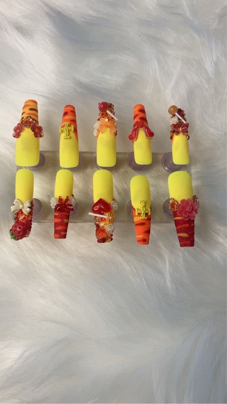 Expertly crafted for a striking look, CHARMS & STRiPES (#KK343) offers 3XL coffin-shaped press-on nails. The vibrant yellow base is accented with bold, orange striped tips and a variety of charming accents. Make a statement with ease and confidence.