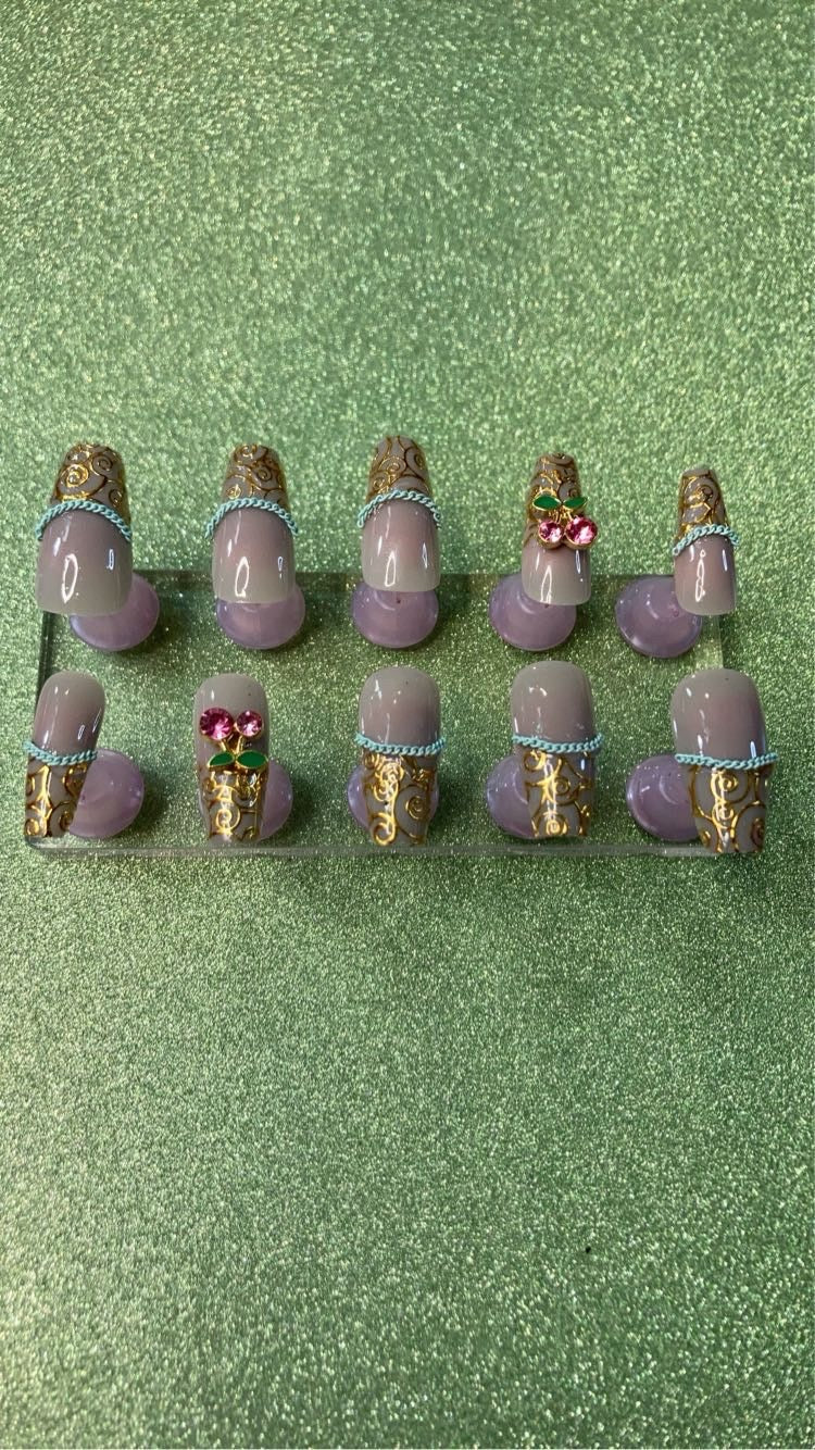 Elevate your manicure with CHERi CHERRY (#401), featuring medium square-shaped press-on nails in a sophisticated jade green. Each nail showcases elegant gold swirl French tips, delicately outlined with light green nail chains for a refined touch. Topped with a charming cherry accent and sealed with a glossy top coat, this set combines artistry and durability for a polished, expert finish.