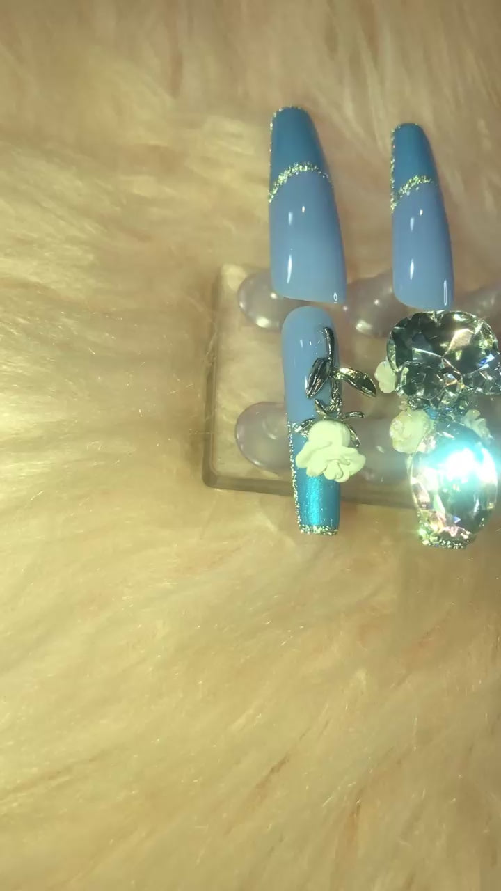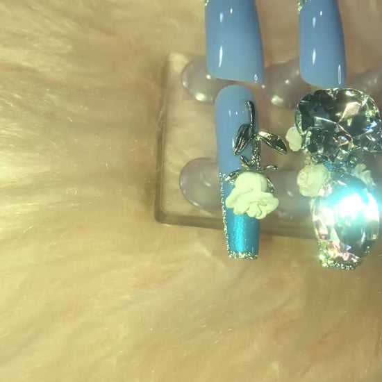 These 3XL coffin-shaped press-on nails feature a stunning Cinderella-inspired palette with light blue French tips delicately outlined in sparkling silver polish. Some nails are adorned with a long white rose. With other nails are adorned with large silver jewels, and white rose accents paired with silver rhinestones, creating an elegant and eye-catching design. Finished with a glossy top coat, this set offers a flawless, high-shine look perfect for making a sophisticated statement.
