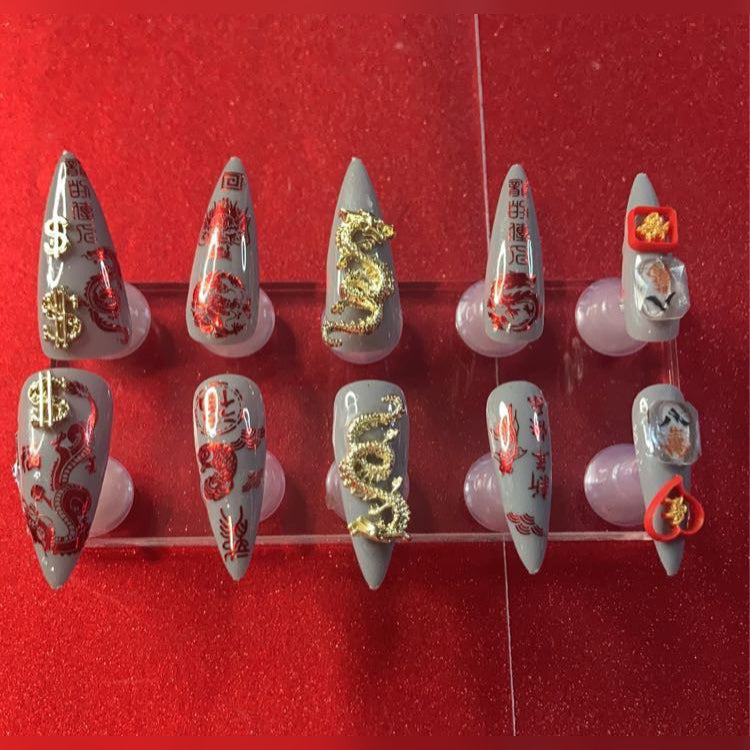 Elevate your nail game with the GOLDEN DRAGON (KK#301) XL stiletto shaped press-on set. Featuring a sophisticated grey base adorned with intricate red and gold dragon motifs and oriental symbols, these nails exude bold elegance. Accented with gold dragon and dollar sign charms, each piece is finished with a glossy topcoat for lasting shine and durability. Perfect for those seeking a striking, expert-level design that commands attention.