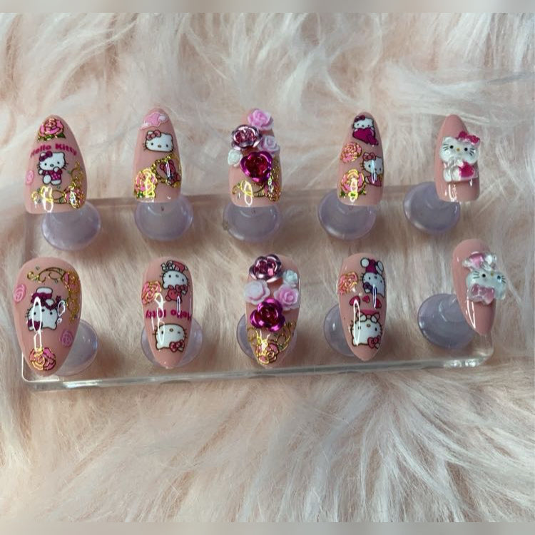 These medium almond-shaped press-on nails showcase a refined Hello Kitty design enhanced by elegant gold accents and an array of pink rose charms. The glossy top coat ensures a sleek, durable finish, making them an expert choice for a sophisticated yet playful manicure.