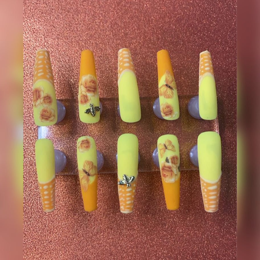 These 3XL coffin-shaped press-on nails feature a vibrant yellow base with striking orange French tips accented by honeycomb patterns. Adorned with delicate butterflies and floral designs, some nails are enhanced with elegant gold bumblebee charms for a unique touch. Finished with a matte top coat, this set offers a sophisticated, long-lasting look perfect for those seeking expert-level nail artistry.