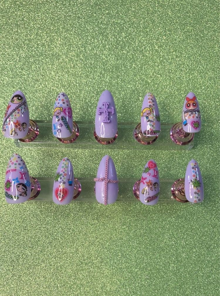 These medium almond-shaped press-on nails feature a light purple base adorned with a unique blend of stoner Powerpuff Girl and Louis Vuitton-inspired designs. Enhanced with delicate purple nail chains and cross charms, each nail is finished with a glossy top coat for a polished, high-end look. Perfect for those seeking a bold, Y2K stylish statement with expert craftsmanship.