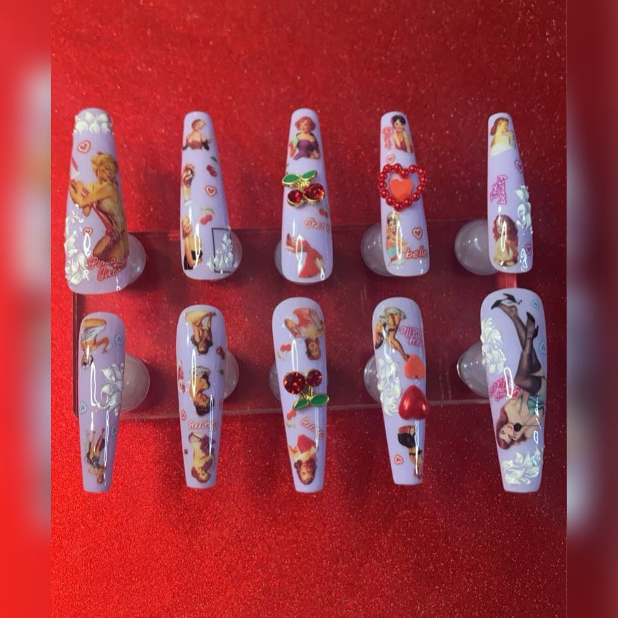 These 3XL light purple coffin-shaped press-on nails feature a stylish & sexy pin-up girl theme, accented with charming red cherry and heart charms. Finished with a glossy top coat, they offer a polished, eye-catching look that combines vintage flair with modern elegance. Perfect for making a bold statement with ease and sophistication.