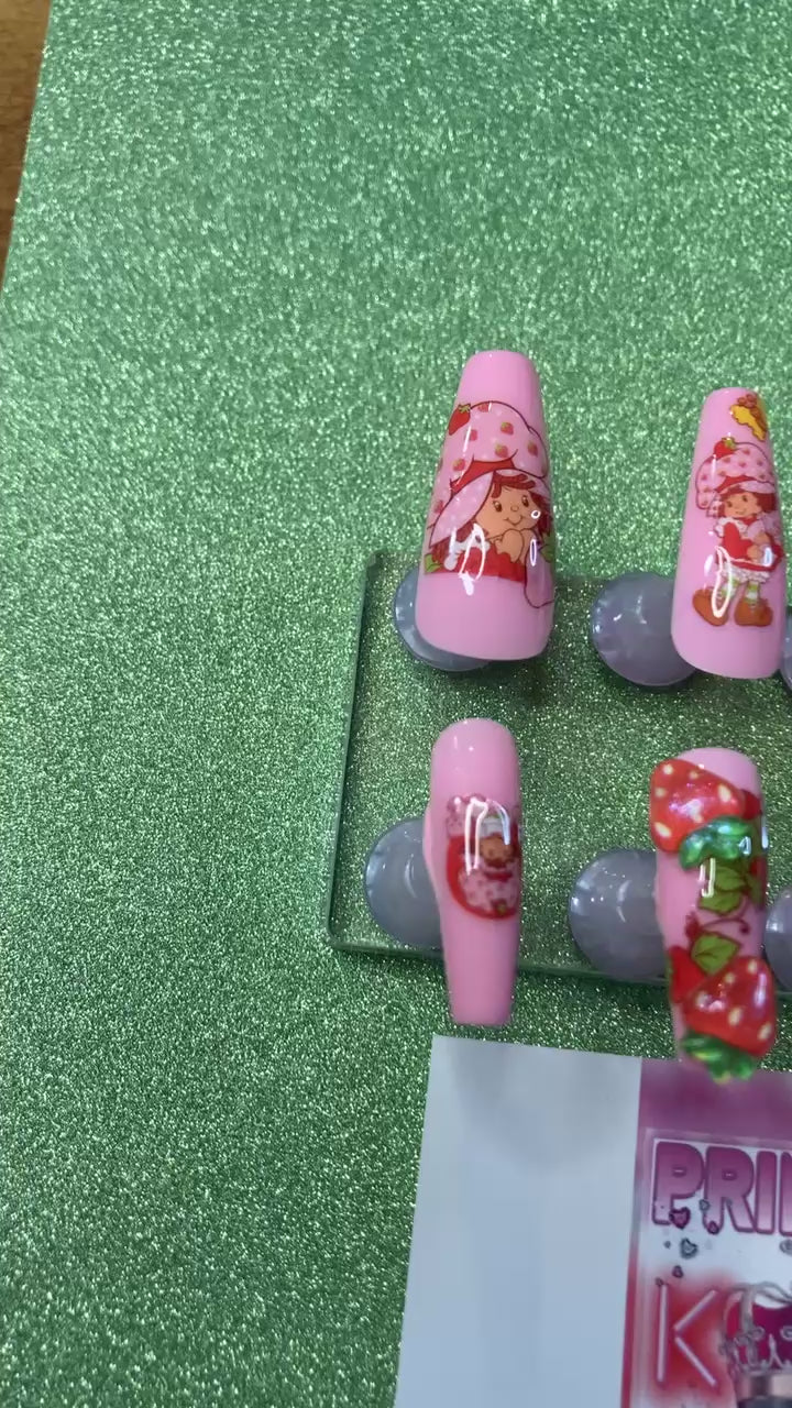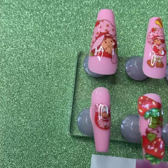 Indulge in this nostalgic nail set with PRiNCESS KK's PRESS ON's! These large, coffin-shaped, Strawberry Shortcake press-ons are adorned with cute fruit charms. Perfect for those who love a touch of pink and a trip down memory lane. Get ready to turn heads with these sweet and playful nails.