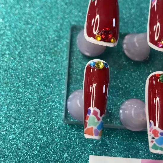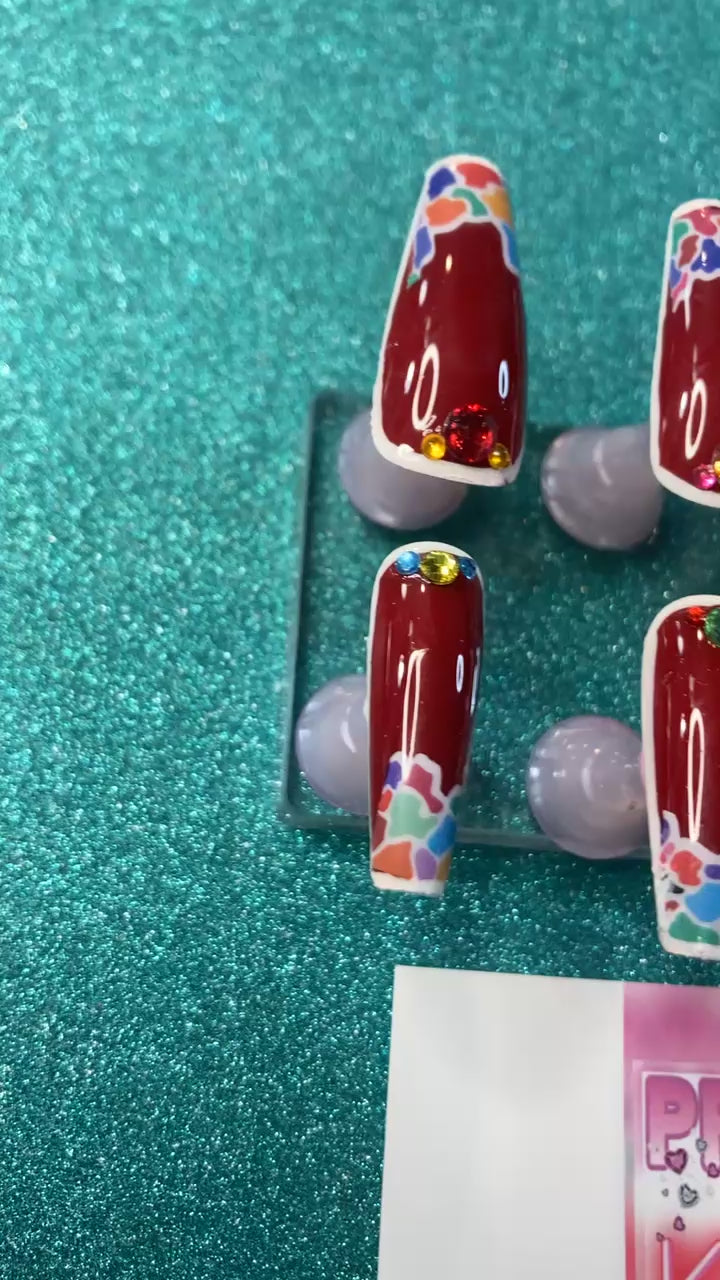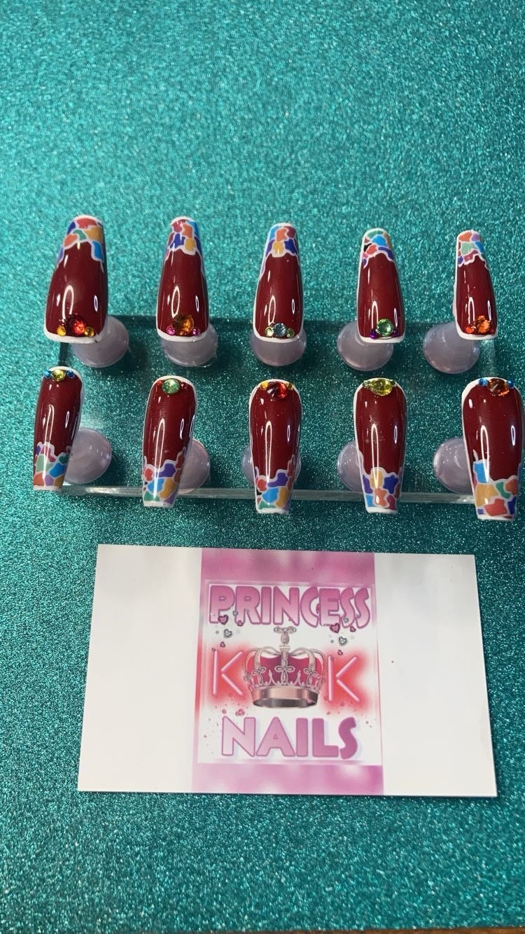 Effortlessly achieve a stylish and unique look with PRiNCESS KK's PRESS ON's (KK#411). These coffin-shaped brown press ons feature a playful rainbow puzzle design and dazzling rhinestones for an eye-catching effect. Perfect for adding a touch of glamour to any outfit. Handmade special for you.