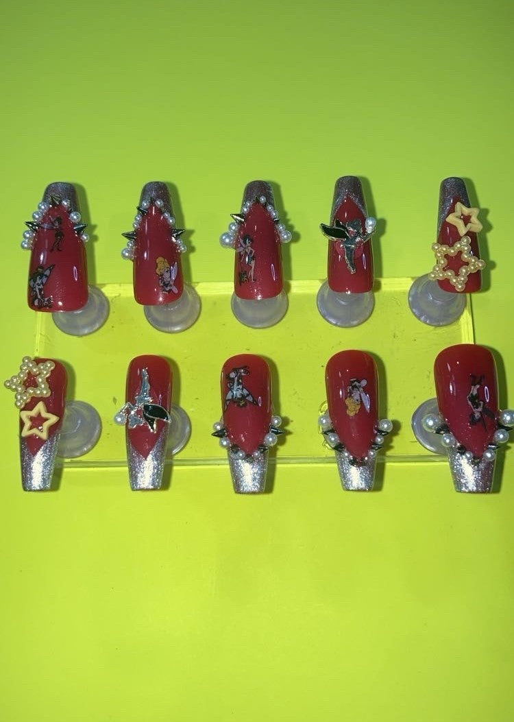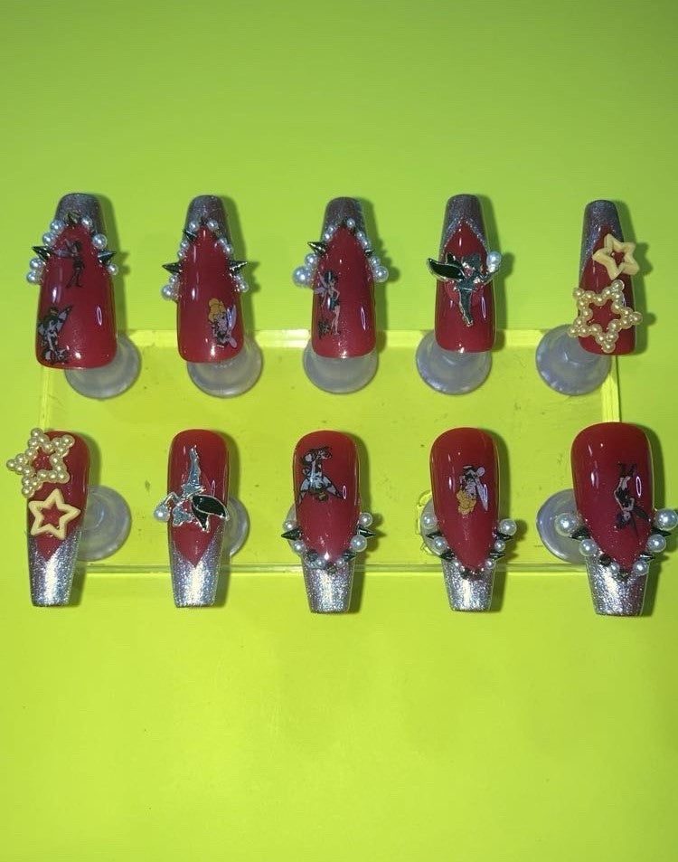 Elevate your nail game with the PUNK TiNKERBELL (KK#429) press-on set. These XL coffin-shaped nails feature a rich ruby red base accented by silver French tips outlined with pearls and edgy nail spikes. Inspired by Disney’s Tinkerbell, the design blends whimsical fairy charm with a bold punk attitude, highlighted by delicate fairy and star nail charms. Finished with a glossy top coat, this set offers a striking, durable look perfect for those who want to express both elegance and edge effortlessly.