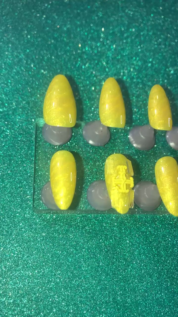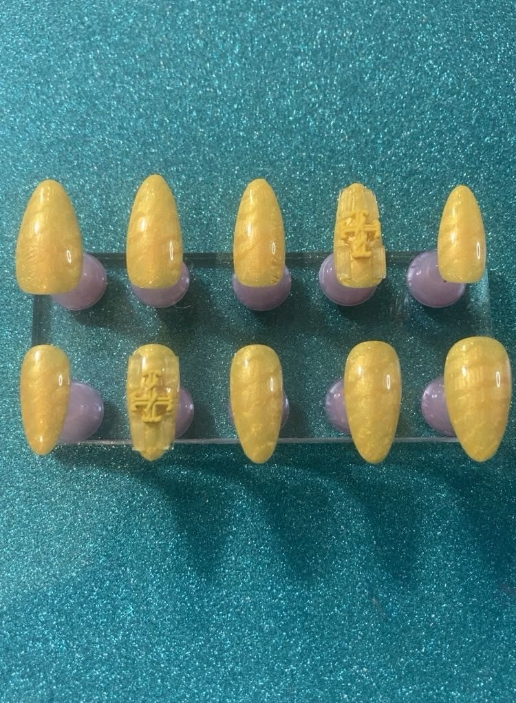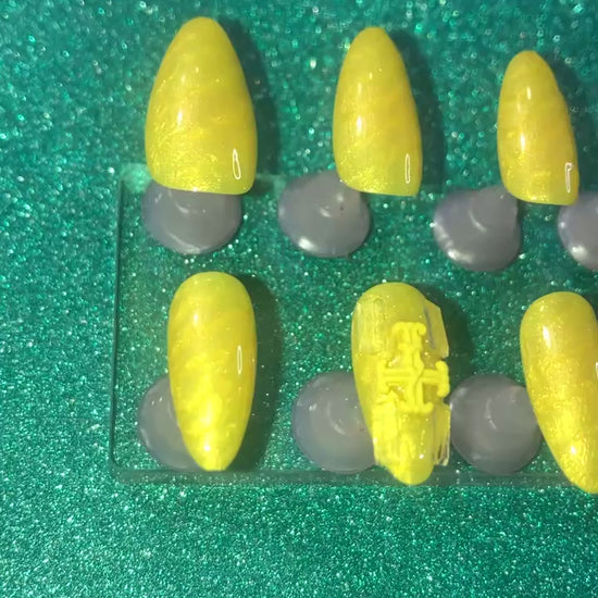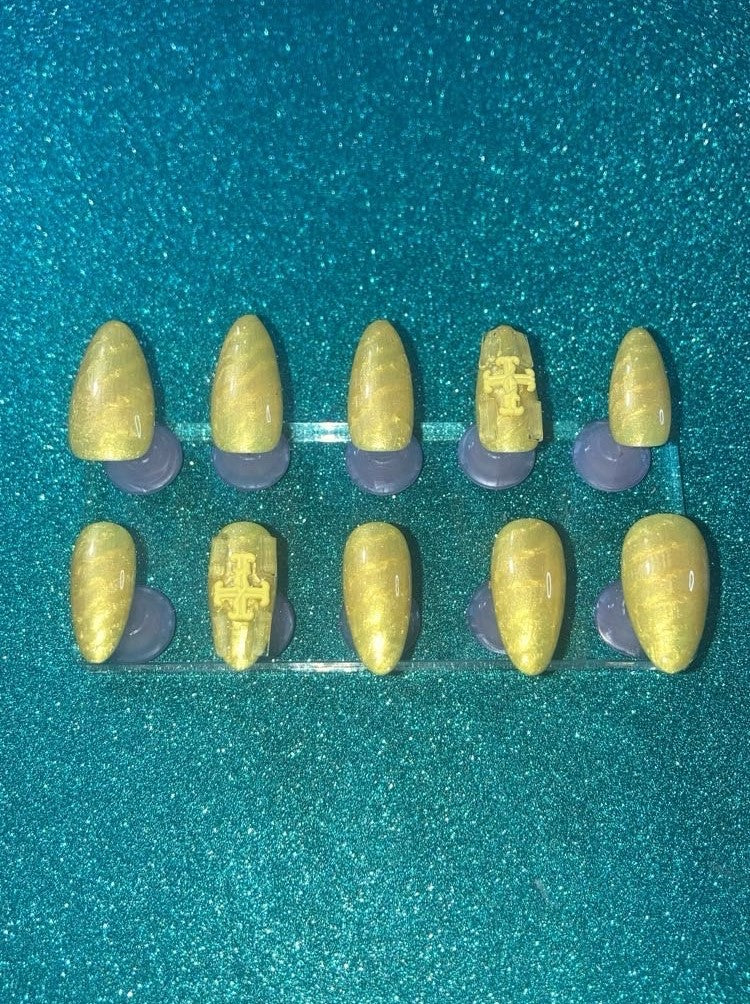 Elevate your look with these medium almond-shaped press-on nails featuring a vibrant yellow base accented by subtle faded stripe designs. Some nails are adorned with delicate yellow cross charms and sparkling window rhinestones, all sealed under a high-gloss top coat for lasting shine and durability. Perfect for adding a sophisticated yet bold statement to your manicure. Stay prayed up in style.