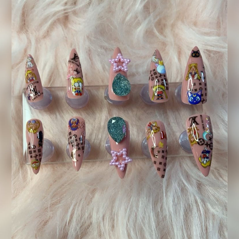 Expertly crafted XL pink stiletto shaped press-on nails featuring Sailor Moon-inspired design elements with authentic Louis Vuitton logo accents and cute charms. Each nail is sealed with a premium glossy top coat for maximum durability and shine. These statement nails deliver salon-quality results with the convenience of at-home application.