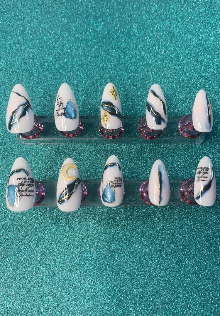 Elevate your style with SKYLiNE iNSPiRATiONS presson nails. Featuring blue marble skies, golden moon and star charms, with words of inspiration. These medium almond shaped white nails are a must-have for any celestial-lover. Topped with a glossy finish, these nails will leave a lasting impression.