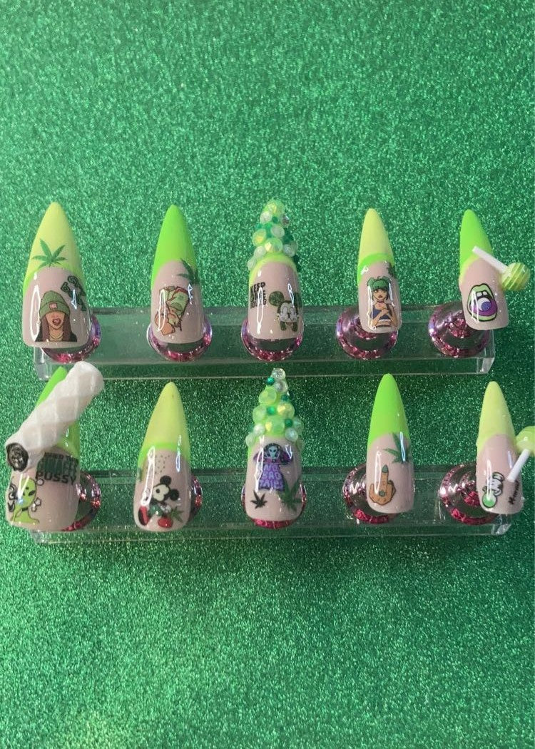 Elevate your nail game with SMOKERS DELiGHT (KK#290), featuring XL stiletto-shaped press-on nails in a chic beige base accented by green French tips. This set embraces a 420 theme with marijuana and trippy stickers, green rhinestones at the tips, and standout charms including a big joint and lollipops. Finished with a glossy top coat, these nails combine bold style and expert craftsmanship for a unique, eye-catching look. Don't want to PUFF PUFF PASS on these one of a kind press-ons.