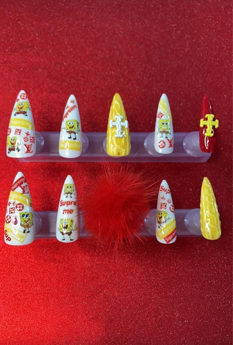 Introducing the SUPREME BOB (KK#275) XL white and yellow sweater pattern ,stiletto press on nails. Featuring a playful design inspired by the one & only Spongebob Squarepants and the Supreme logo. Plus some little charms and a cute red magnetic pom-pom, topped with a glossy finish. Stand out with these nails. Professional quality and easy application.