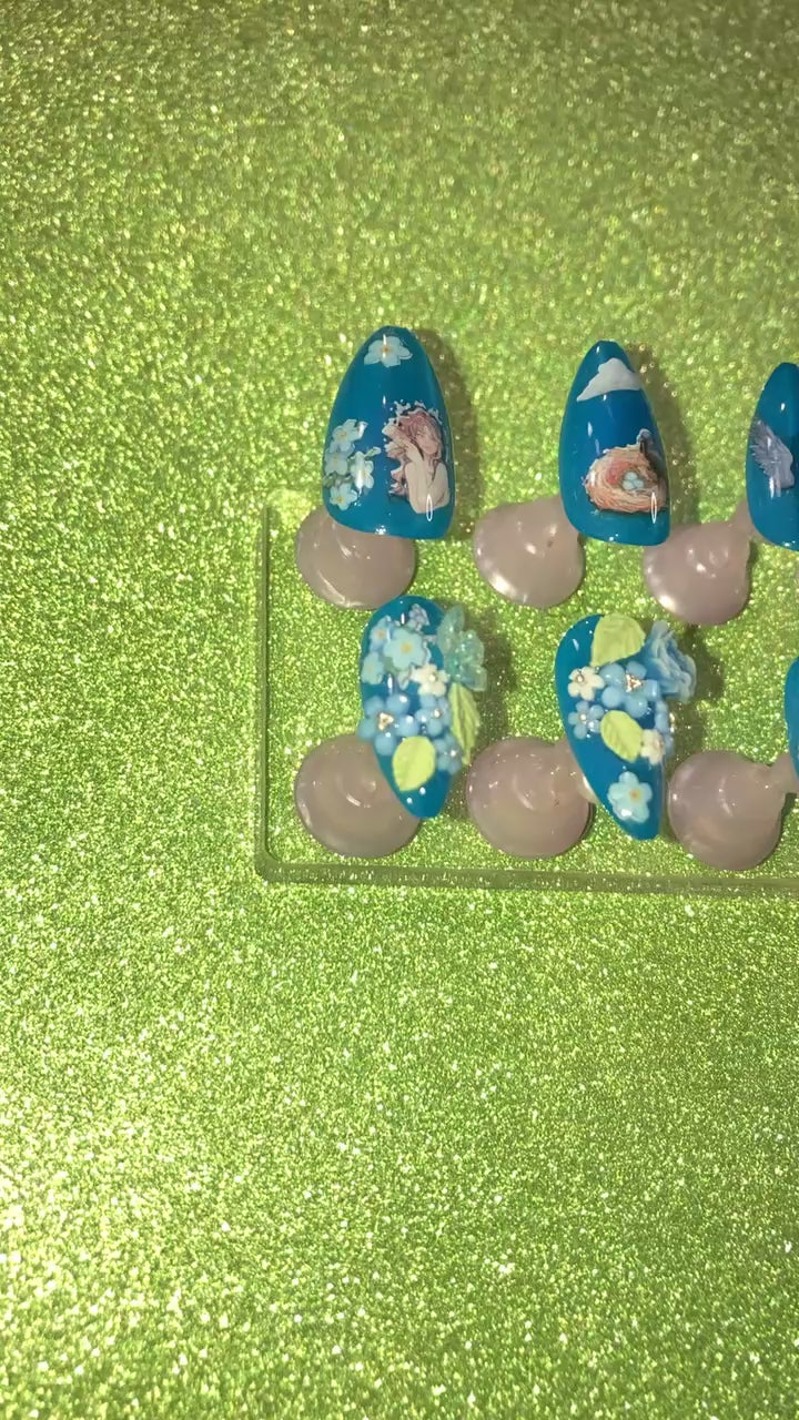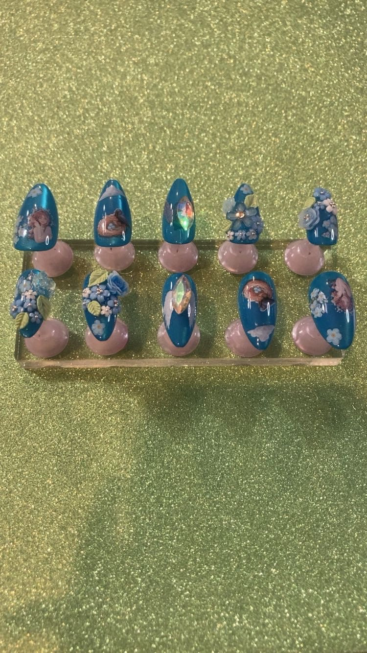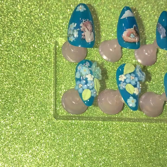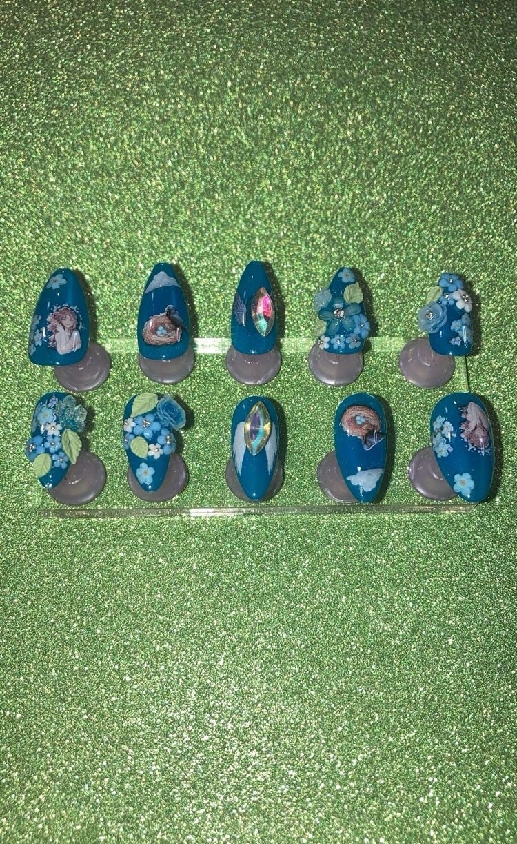 Elevate your manicure with TRANQUiL OASiS (KK#424), featuring medium almond-shaped press-on nails in a captivating & shiny color of blue. Some nails showcase a serene girl immersed in nature, crafted with precise water transfer stickers. Accentuated by delicate blue flower charms and a striking silver rhinestone nestled between angel wings, this set exudes elegance and artistry. Finished with a high-gloss top coat, these nails offer a flawless, eye-catching shine perfect for a sophisticated, nature-inspired look.