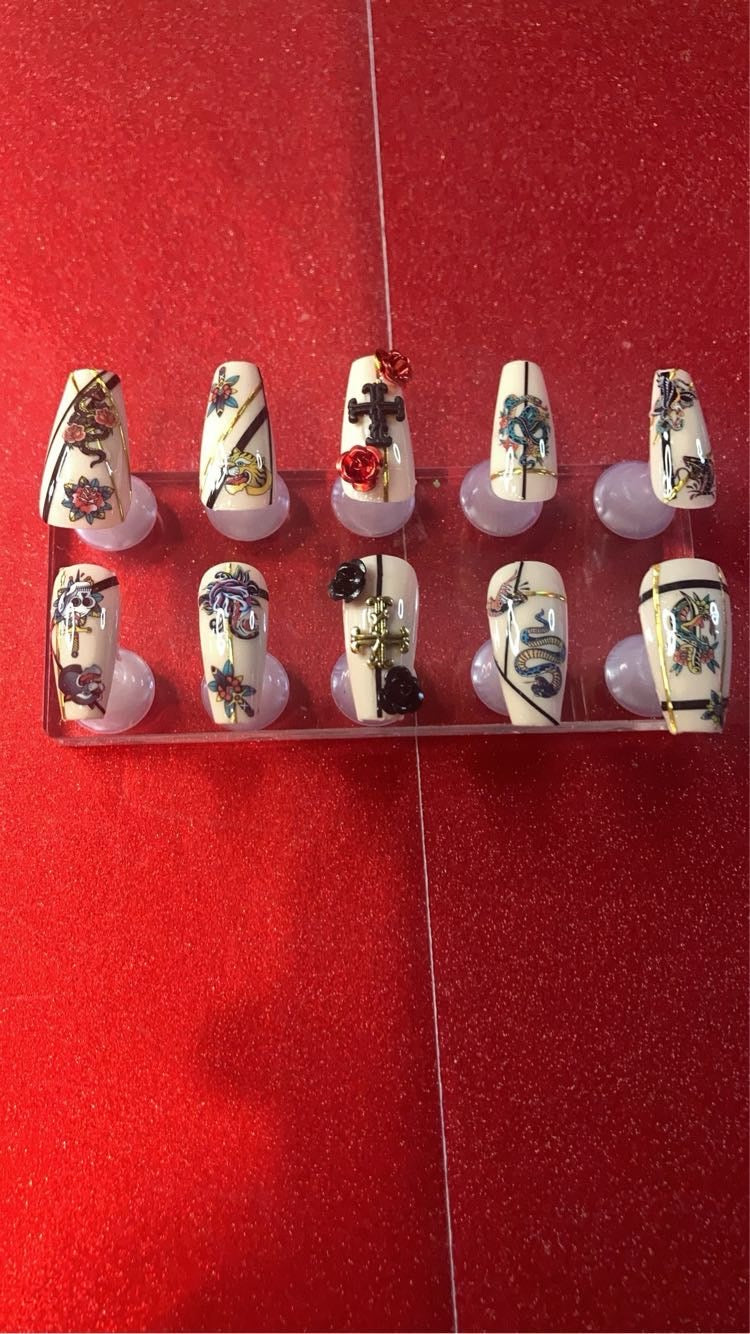 These medium beige coffin-shaped press-on nails feature a striking mix of edgy designs including snakes, skulls, and tigers, enhanced with delicate roses and cross charms. Finished with a glossy top coat, they offer a bold yet polished look perfect for making a confident style statement with ease. These nails are sure to make a hissssss.