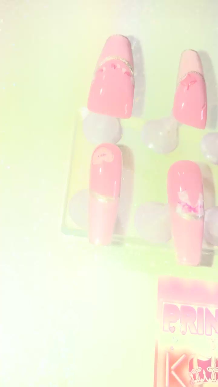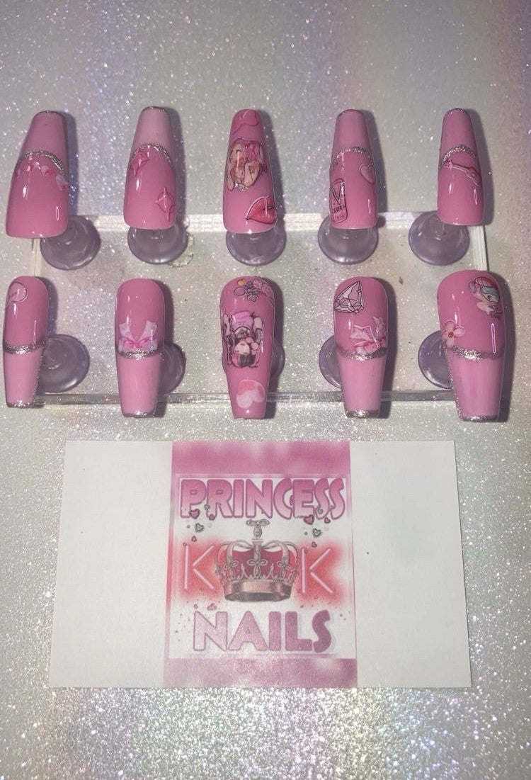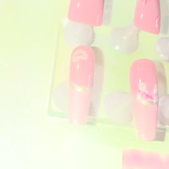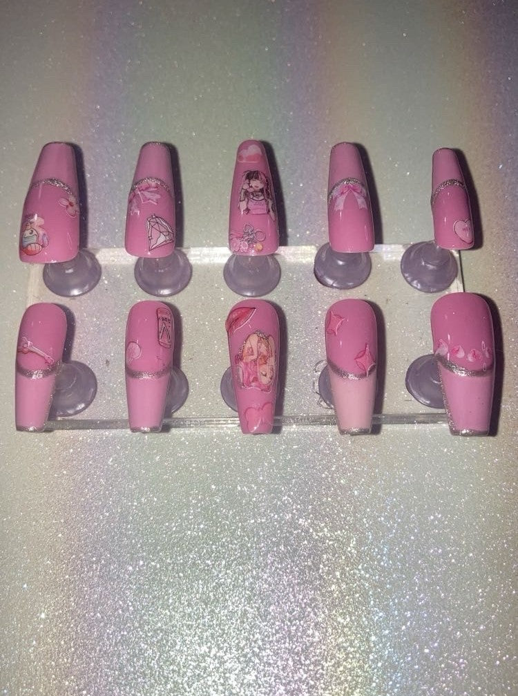 These XL coffin-shaped press-on nails feature a soft pink base with delicate light pink French tips, elegantly outlined in silver polish. Inspired by Y2K aesthetics, the design incorporates intricate water transfer stickers for a unique, nostalgic flair. Finished with a high-gloss top coat, these nails offer a durable, salon-quality shine that enhances their vibrant details and ensures long-lasting wear. Perfect for those seeking a bold yet refined statement with expert craftsmanship. Chill nails that remind you of the chill times from back in the day.